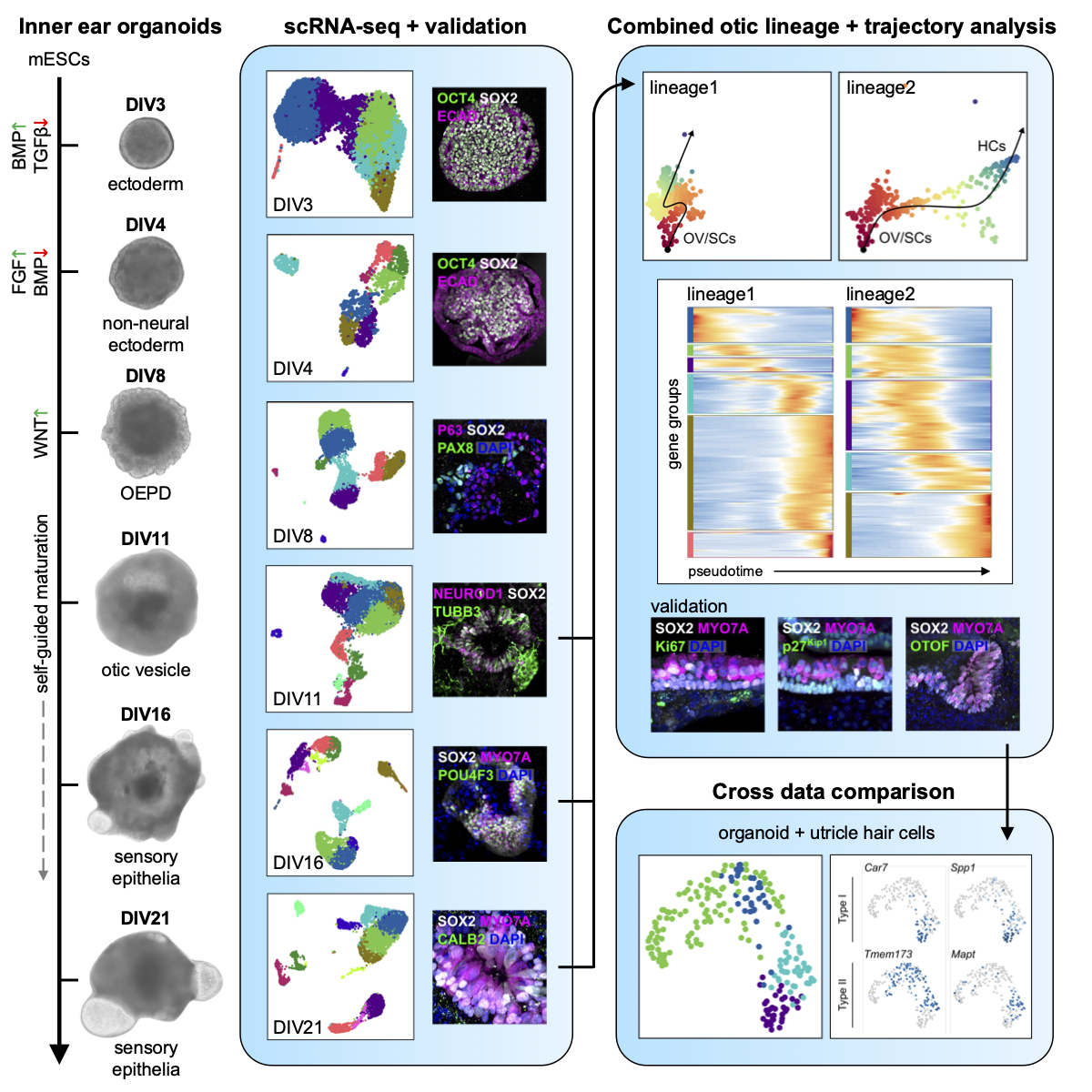 Our manuscript detailing the development of mouse embryonic stem cell-derived inner ear organoids is now out in iScience! This single-cell “developmental atlas” maps the progression of otic progenitor cells into inner ear supporting cells and hair cells, providing valuable insights into the formation of inner ear sensory epithelia within the organoid system. Additionally, we identified an interesting phase during which proliferating otic progenitors simultaneously generate hair cells and otic neuroblasts before transitioning to a non-proliferative state. This detailed mapping of otic development offers a valuable resource for future research into cell cycle regulation and lineage specification in inner ear organoids. Read more about it here!